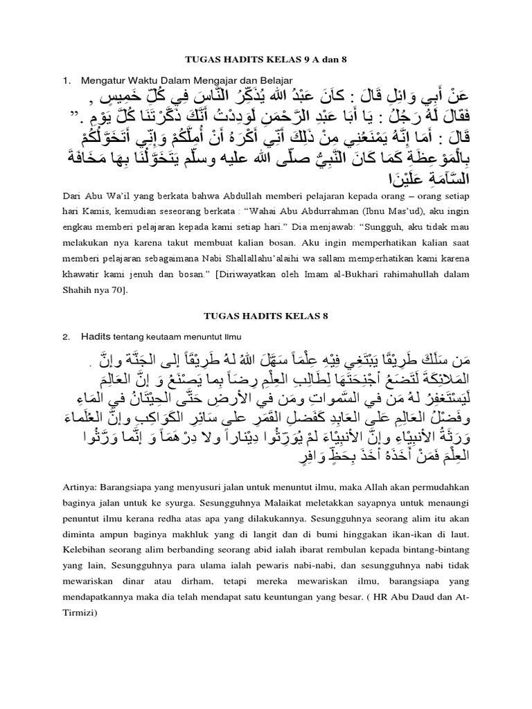 Hadits tentang menuntut ilmu kelas 9. Belajar dalam ajaran islam tidak mengenal batas ruang dan waktukeutamaan menuntut ilmu adalah bahwa ia adalah jalan menuju surga. Ini menjelaskan bahwa menuntut ilmu itu hukumnya wajib bagi setiap muslim. Homepage hadits tentang menuntut ilmu kelas 9. Llmu adalah petunjuk bagi seorang muslim 4 terhadap perbuatan perbuatan baik dan akan menumbuhkan cahaya dalam hati yang akan membantu untuk membedakan antara yang haq dan batil atau perbuatan yang baik dan buruk. Menyebutkan arti al hadits tentang menuntut ilmu. Sebaiknya kita ikuti pembahasan selengkapnya mengenai hadits tentang menuntut ilmu berikut di bawah ini. Yang dimaksud ilmu disini bukan hanya ilmu agama saja tetapi ilmu umum sebagai bentuk pengetahuan. Agama islam kelas 9 bab 2 kewajiban menuntut ilmu blog penambah ringkasan materi pai kelas 9 bab 2 hadits menuntut ilmu soal bab ii kelas 9 semester 1 hadi. Hadist menuntut ilmu kali ini akan dibahas tentang dalil hadits tentang menuntut ilmu lengkap lafadz arab dan artinya. Hadits yang diriwayatkan oleh imam muslim dalam shahihnya dari hadits abu hurairah radhiyallahu anhu sesungguhnya nabi وسلم عليه اهلل صلی bersabda. Kelas 9 semester1 bab.