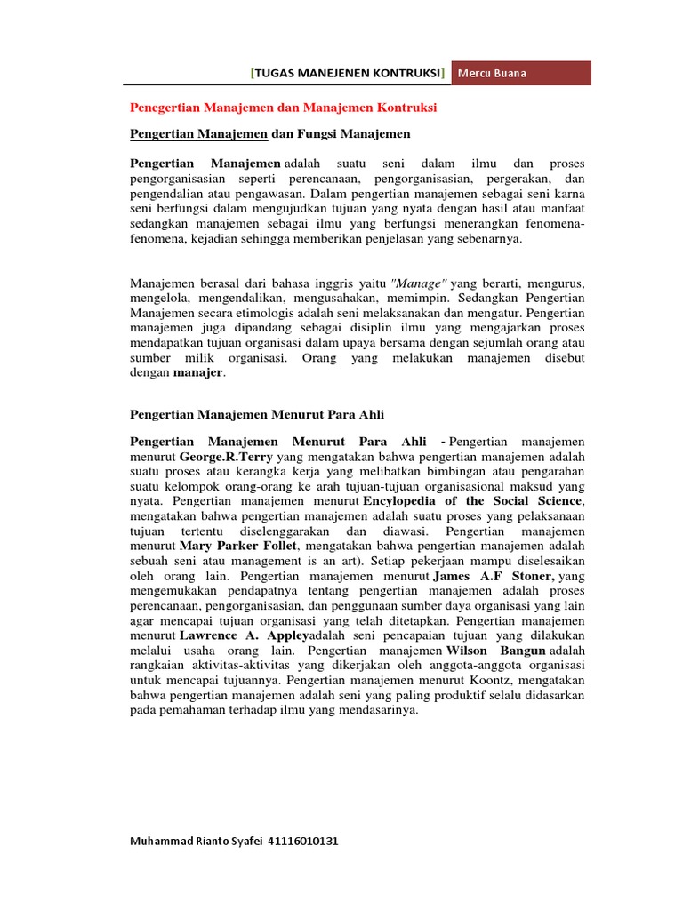 Pengertian Manajemen Sebagai Ilmu Proses Dan Seni. Penegertian Manajemen Dan Manajemen Kontruksidocx