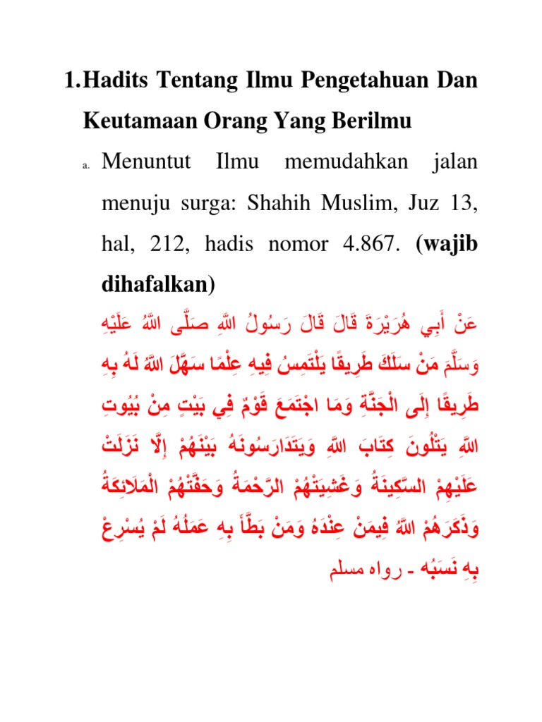Sumber : konsultasisyariah.com Hadits Tentang Keutamaan Orang Yang Menuntut Ilmu