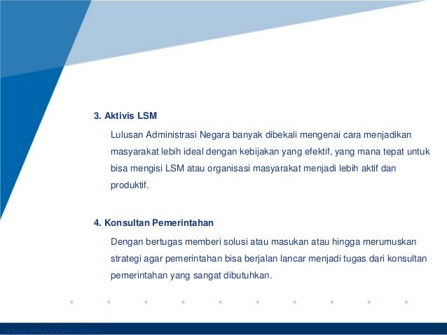Prospek kerja jurusan ilmu administrasi negara. Prospek kerja jurusan administrasi negarapublik. Terlibat aktif mewujudkan visi dan misi kebangsaan melalui partai politik menjadi salah satu prospek kerja bagi lulusan administrasi negara dengan menjadi anggota ataupun aktivis di dalam suatu partai politik. Peluang kerja yang cukup bergengsi yang terbuka antara lain bumn general affairs peneliti wirausahawan birokrat analis dan lain lain. Tapi prospek luuuar biasa. Perusahaan swasta tentu saja tetap membutuhkan para. Semoga dengan adanya tulisan ini dapat menambah wawasan dan juga menambah pengetahuan bagi setiap pembaca yang sedang mencari refrensi masa depan jurusan administrasi negara. Prospek kerja untuk lulusan jurusan ilmu administrasi negara di unas cukup luas. Baik sebagai pegawai negara maupun swasta. Banyak yang bertanya klo lulusan administrasi negara nanti kerjanya di mana sih. Prospek kerja dalam sebuah studi atau jurusan menjadi suatu pertimbangan penting bagi para peminatnya sebelum memutuskan untuk masuk dalam studi tersebut. Terlibat aktif dan bekerja dalam menjalankan roda pemerintahan baik itu dalam poros pusat atau jangkauan daerah menjadi pekerjaan inti dari lulusan jurusan administrasi negara.