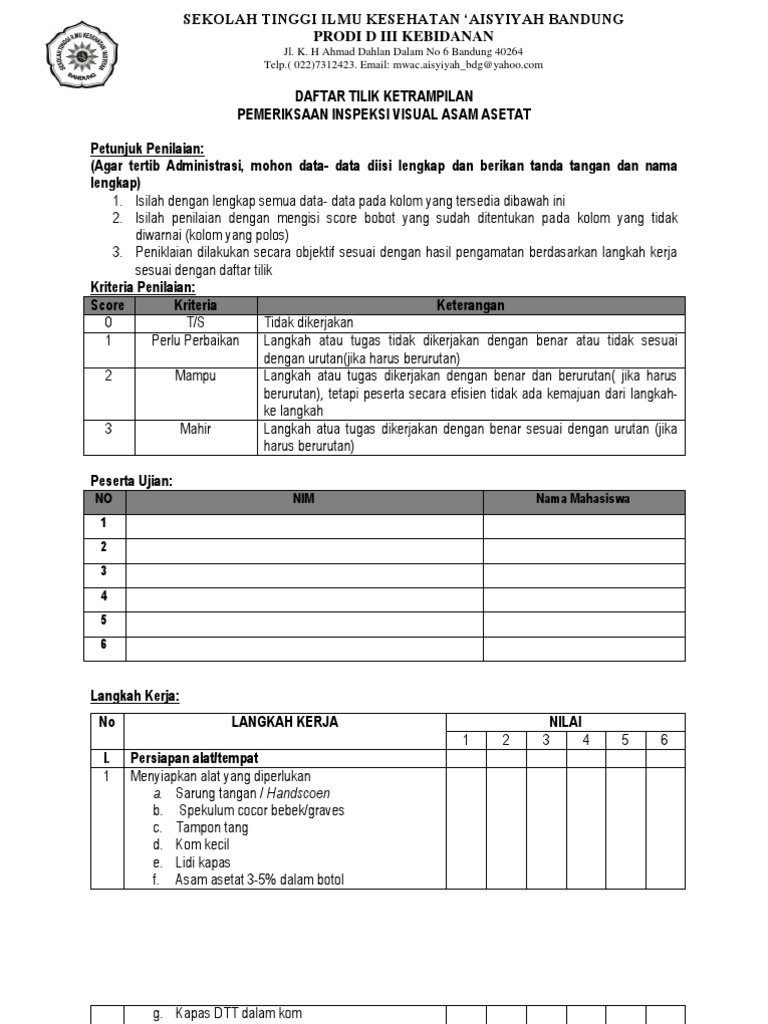 Sekolah Tinggi Ilmu Kesehatan Aisyiyah Bandung Kota Bandung Jawa Barat. Daftar Tilik Iva Stikes Aisyiyah 2013