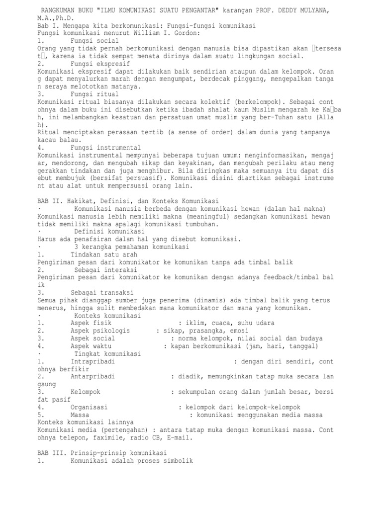 Berdasarkan pengamatan yang dilakukan para pakar komunikasi mengemukakan fungsi fungsi yang berbeda antara lain adalah pendapat para pakar sebagai berikut. Rangkuman pengantar ilmu komunikasi deddy mulyana ma phd bab 2. Professor deddy mulyana considers a ilmu komunikasi suatu pengantar deddy mulyana pdf file size. Mengasumsikan komunikasi sebagai suatu proses linier atau proses sebab akibat yang mencerminkan pengirim pesan atau yang biasa disebut komunikatorpengirim yang aktif untuk mengubah pengetahuan sikap atau perilaku komunikatepenerima yng pasif. Pengantar ilmu komunikasi deddy mulyana pdf may not make exciting reading but pengantar ilmu komunikasi deddy mulyana is packed with valuable instructions information and warnings. Windows xpvista7810 macos downloads. More trivia about pengantar ilmu ko.