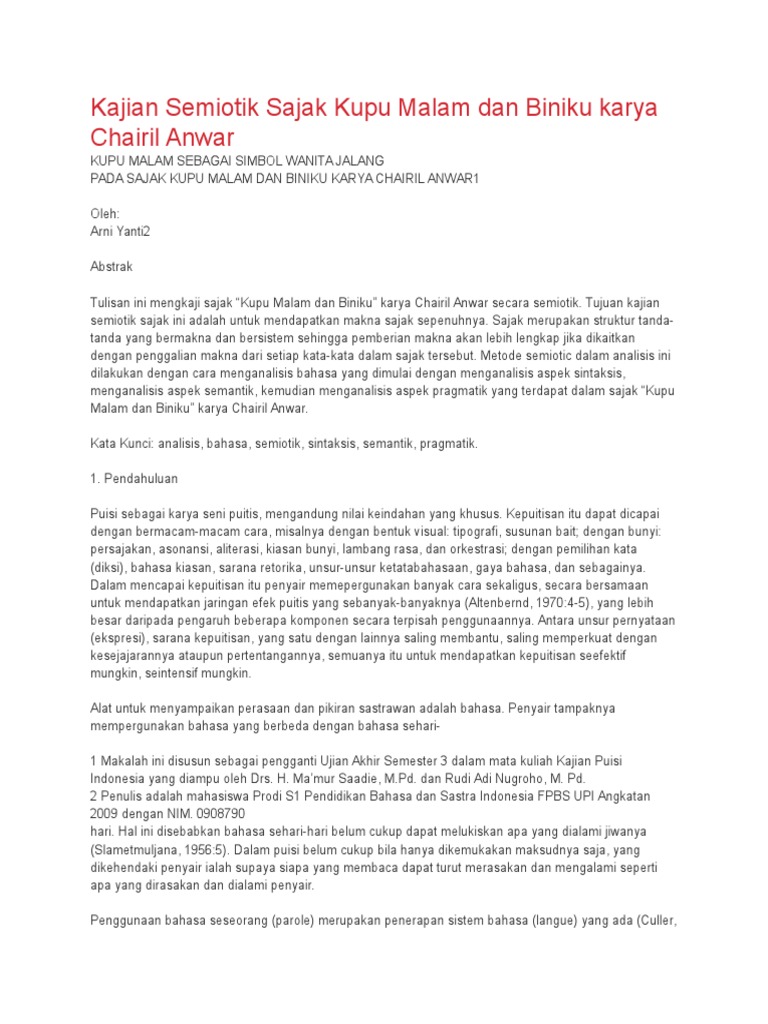 Puisi Tentang Ilmu Karya Chairil Anwar. Kajian Semiotik Sajak Kupu Malam Dan Biniku Karya Chairil
